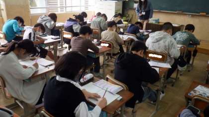 宿題の漢字ノートの使い方を確認しています。とても丁寧な字で書いていました。