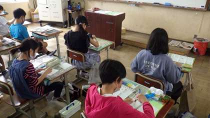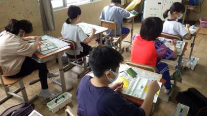 絵の具を使って,思いのままにいろいろな模様を描く学習をしています。ローラーやひもなどのいろいろな物を使って描いています。