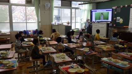 教室で配膳を待つ時間に,1年生の教室では,「エプロンのたたみ方」の動画を見てたたみ方を確認しています。