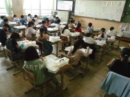 子どもたちは,絵の具の使い方で気を付けることを確認したあと,丁寧に筆で色を置いていました。