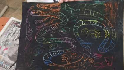 図画工作科の学習では,画用紙にパスで模様を描き,その上からうろのパスで塗り,竹串で削って絵を描きました。