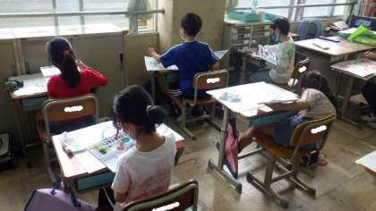 絵の具と水を使っていろいろな色をつくったり,筆の使い方を工夫したりして,いろいろな線や形をかいています。