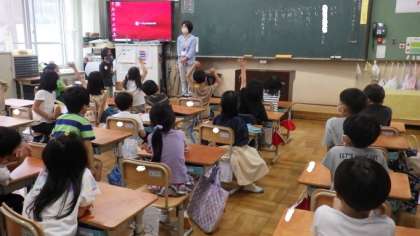 国語の学習で「い」ではじまる言葉を考えています。たくさんの子どもたちが発表していました。