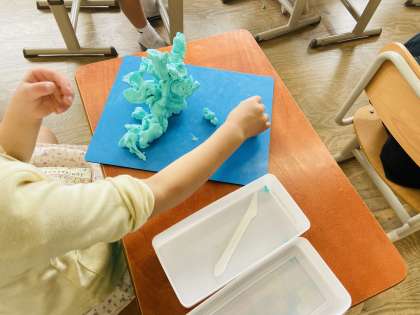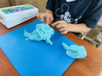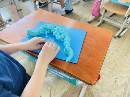 図画工作科『にぎにぎねんど』では,粘土をにっぎってできた形から何に見えるかを想像し,粘土を付け足しながら作品を作りました。