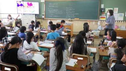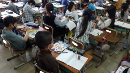 乾電池を使ってモーターを回して,気付いたことを話し合っています。
