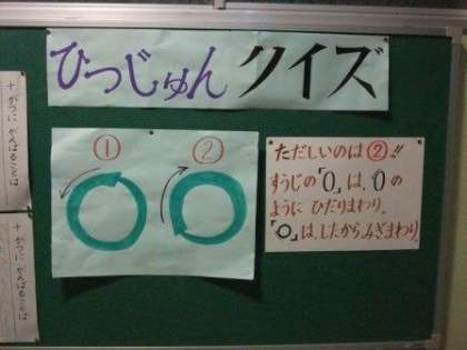 南校舎に入って2階に上がると、そこは1年生の廊下です。その上がったところに「筆順クイズ」があります。前回は「上」という漢字の一画目はどこから?というクイズでした。