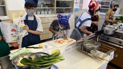 今日は5年3組がゆで野菜サラダの調理実習をしています。調理の手順をしっかりと確認したり,ドレッシングの調味料の分量を正しく量ったりしながら,おいしいゆで野菜サラダを作ろうとがんばっていました。