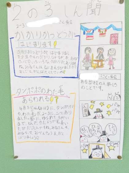 掲示係の子たちが,クラスのニュースをみんなに知らせたり,見た人に笑顔になってもらったりするために新聞を作っていました。
