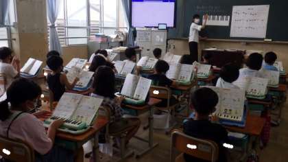 「かっこう」の曲の音の高さに気を付けながら,鍵盤ハーモニカで演奏する練習をしています。どの音をどの指で弾くか確認しながら,運指(演奏する時の指づかい)の練習をしました。