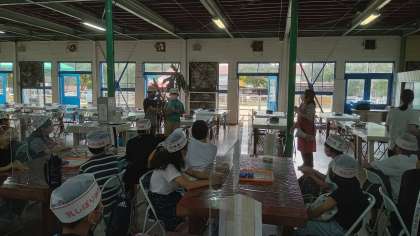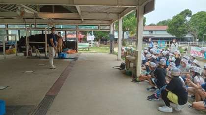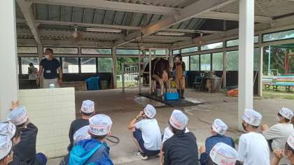 まず,乳絞り体験をします。牧場の方から絞り方の説明を聞きます。