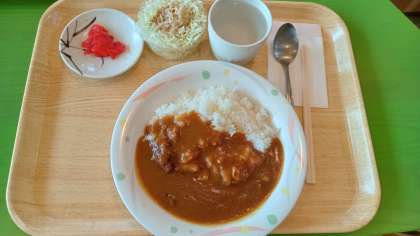 今日の昼食のメニューはカレーです。スパイスの効いたカレーが暑い中でも食欲をそそります。