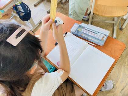 算数科『長さ』の学習では,身の回りにある様々な物の長さを予想し,物差しを使って実際の長さを計測しました。