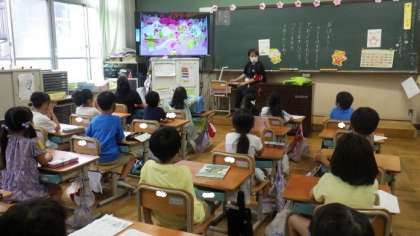 読み聞かせボランティアの皆様が1年生の教室で読み聞かせをしてくださいました。不思議なお話や海水浴の話など、いろいろな話を楽しみました。
