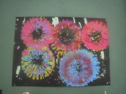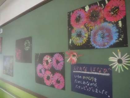 トイレットペーパーの芯に細かく切れ目を入れた物でスタンピングをし,色の重なりを楽しみながら,思い思いの花火を描くことができました。
