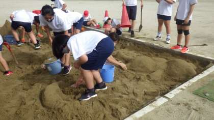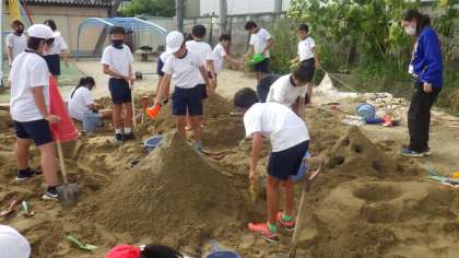 運動場の砂場を使って、造形遊びの活動をしました。自然を感じる空間にするために、いろいろな形を楽しんでつくっていました。