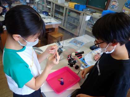 5年生は、理科の学習で「顕微鏡」を使って朝顔の花粉を観察しました。朝顔からおしべをピンセットでとって、スライドガラスに花粉をつけました。顕微鏡で100倍に拡大された花粉の形は、思っていたよりもトゲトゲしていたようで、驚いている子が多く見られました。