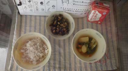 今日の給食では、大豆やひじき、三度豆に鉄が多くふくまれています。