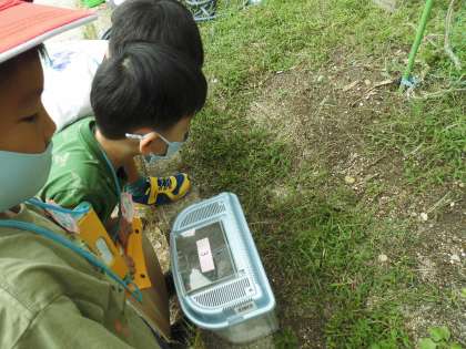 今日は運動場で「いきものはかせ」を目指し,ダンゴムシやバッタなどを一生懸命探しました。