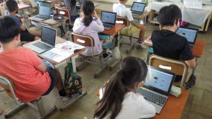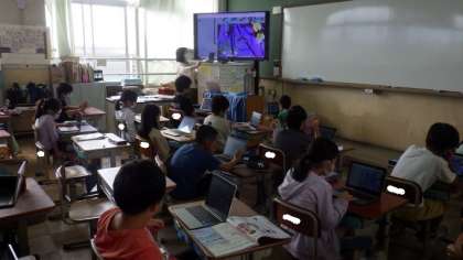 タブレットのロイロノートを使って、友達が撮った写真のデータを共有し、みつけた動物(こん虫など)や場所について交流しています。