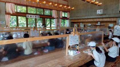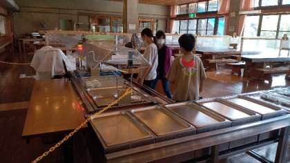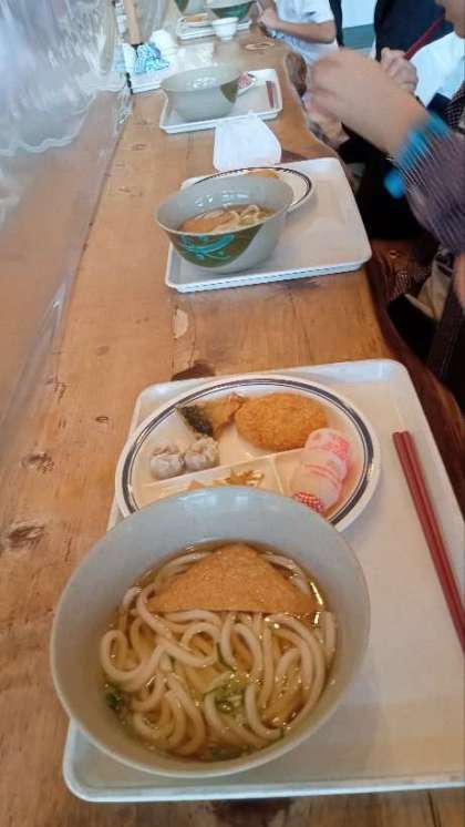 昼食のメニューです。コロッケやシュウマイ、サラダはお代わりができます。作りたての美味しい惣菜に食欲が進みます!