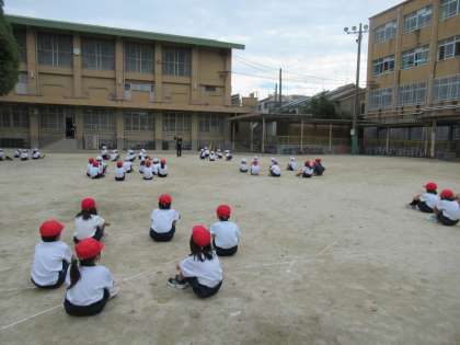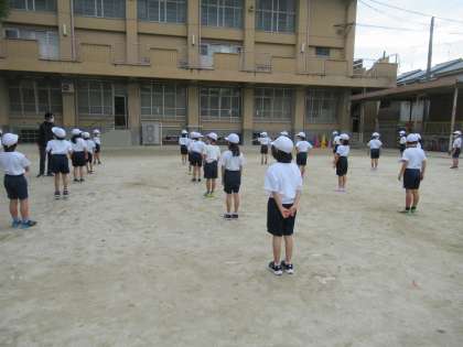 体育館より広い運動場で場所を確かめるのは少し難しい様子でしたが、他のクラスの友達とも列をそろえようと一生懸命。