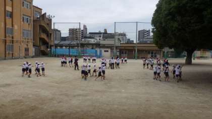 スポーツ大会に向けて、リズムダンスの練習をしています。今日は運動場で隊形移動の練習をしました。