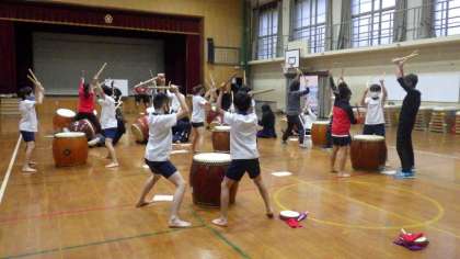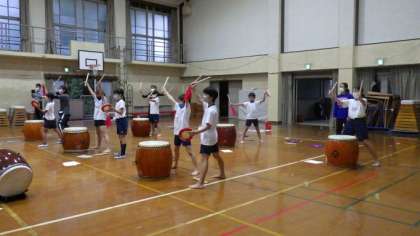 150周年記念式典での和太鼓演奏に向けて、5・6年生の希望者と和太鼓部OBの生徒で練習をがんばっています。先輩に教えてもらったり、一緒に演奏したりすることで、5・6年生もどんどん上手になっています。