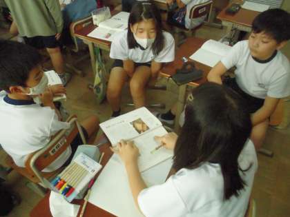 国語の「世界にほこる和紙」の学習では、筆者の考えが書かれている段落と、全体を「初め」「中」「終わり」に分けるとどこでわけられるのかをグループで話し合いました。段落のつながりや内容を根拠に発表することができていました。