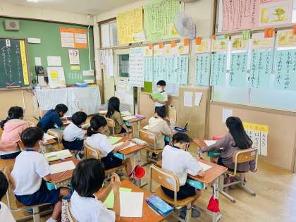 国語科の学習では、『お手紙』というお話を登場人物になりきって音読劇をするために、登場人物のしたことや気持ちを基に、音読劇に表すことができる工夫について考えてきました。