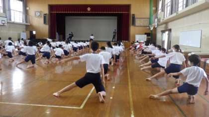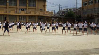 スポーツ大会の団体演技「京炎そでふれ」の練習をがんばっています。今日は前半は体育館で踊りの練習をしました。後半は運動場で隊形移動も入れた練習をしました。