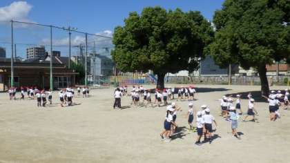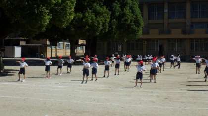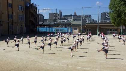 スポーツ大会の団体演技の練習をしています。曲に合わせて元気に体を動かしています。隊形移動の練習もしました。