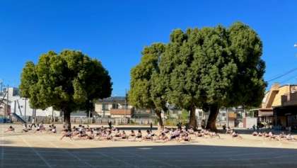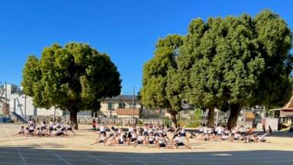 スポーツ大会の団体演技「ソーラン節」の練習をしました。今日は運動場で、入場から退場までを通して練習しました。