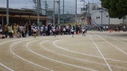 4年生の80メートル走の様子です。5年生の応援団も元気よく応援しています。