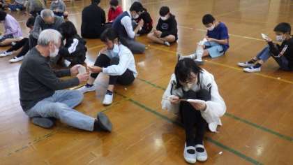 2時間目は6年2組が京扇子の体験をしました。体験の前には、扇子の歴史や種類などについての話を聞いて、はじめて知ることもたくさんありました。