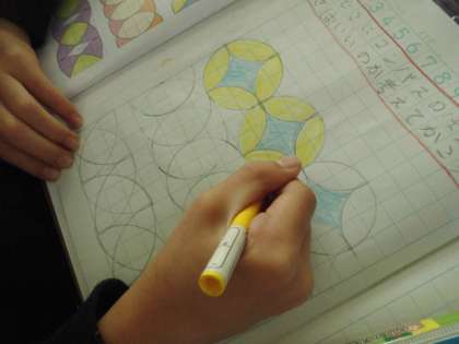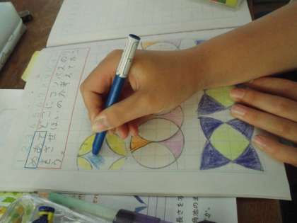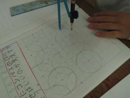 算数科『円と球』で、コンパスを使った模様づくりの学習をしました。子どもたちは、円の中心の位置を考えながら、集中して取り組んでいました。