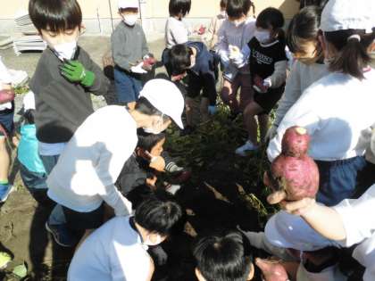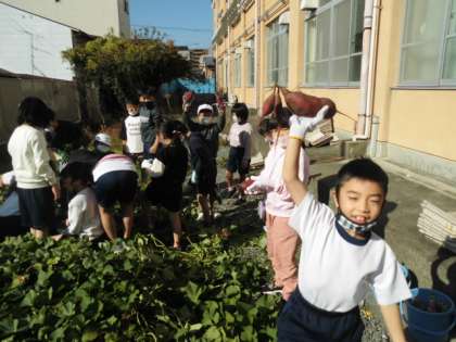 生活科で育ててきた「サツマイモ」をほりました。青々としたツルと葉をかきわけると、大きなサツマイモが顔をだしました。はじめはみんな、できてるかなと不安だったのが、満面の笑み。大喜びでした。