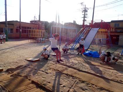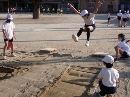 今日の体育は、走り幅跳びでした。高く遠くに跳ぶために、手を大きく振り上げたり、強く踏み切ったりと工夫を考えて実践しています。
