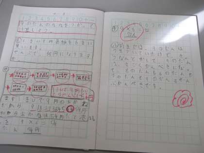 子ども達は、ただ答えを求めるだけでなく、「何のいくつ分で○×△になる」というかけ算の考え方を使って、自分なりに図や文にしながら考え意見を交流していました。