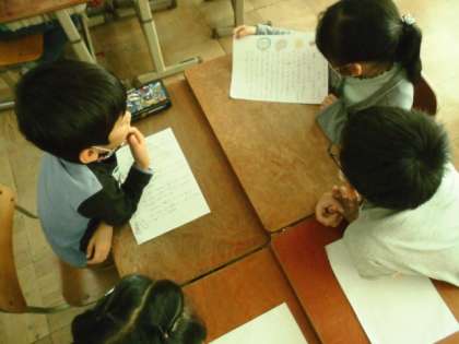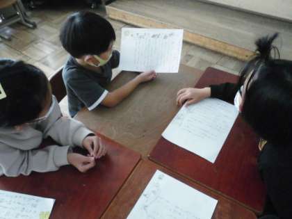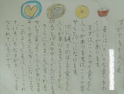 国語科『食べ物のひみつを教えます』の学習で、姿を変えて食べられている食品を調べて文章にまとめたものを、友だちに伝えました。