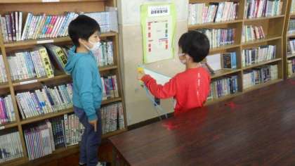 今日の中間休みも、たくさんの子どもたちが図書室へ来館していました。図書委員手作りのしおりのプレゼントや、図書クイズなどを楽しんでいる様子です。