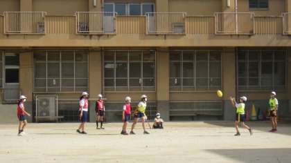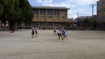 ボールの扱いや規則、ゲームの進め方を確認しながら、タグラグビーのゲームを楽しんでいます。