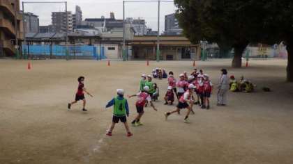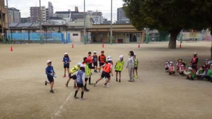 リレーの仕方に慣れ、確実にバトンパスをして相手チームと競走することを楽しんでいます。