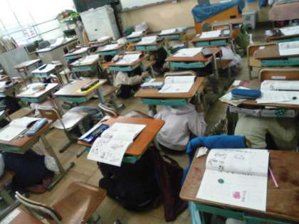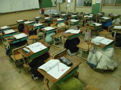 今日は、大地震を想定した避難訓練を実施しました。子どもたちは、訓練を開始する放送があるとすぐに机の下に隠れ、その後も速やかに運動場へ避難していました。