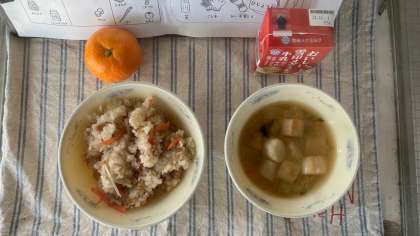 今日は、給食室でほかんしておいた米やかんづめなどの食材を使って、給食を作りました。