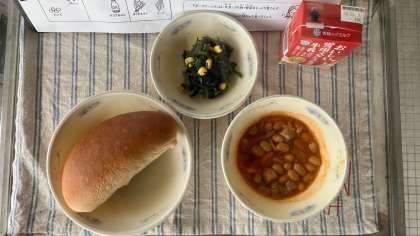 「ポークビーンズ」は、大豆・ぶた肉・野菜をじっくり煮こんだトマト味の献立です。パンといっしょに味わって食べてほしいと思います。