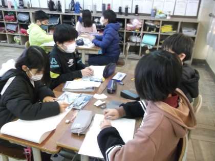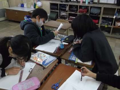 算数の学習で、正六角形の書き方を考えました。コンパスや分度器を使って様々な書き方を考え、班のみんなで交流しました。