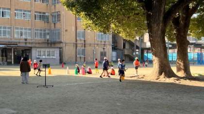 リレーの学習をしています。練習を重ねるにつれてバトンパスがスムーズになってきました。