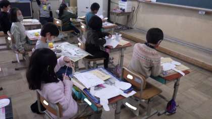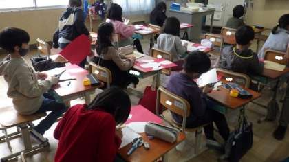 紙版画に取り組んでいます。顔や髪の毛など、細かい部分まで切って、紙版画の版をつくっています。