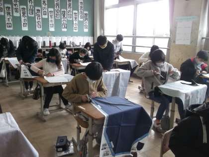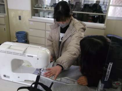 家庭科の学習で、エプロンつくりに挑戦しています。少しずつミシンの操作にも慣れてきて、黙々と製作をしていました。