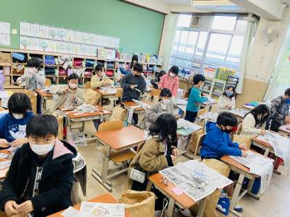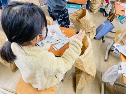 図画工作科『くしゃくしゃ ぎゅっ』では、くしゃくしゃにした紙を入れた袋を変身させ、自分の友達を作ります。